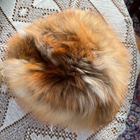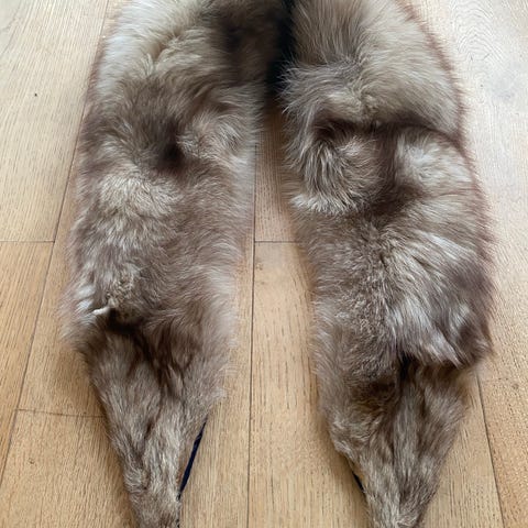 Ubetydelig brukt (kanskje to ganger) lue og skjerf i reveskin selges. Begge deler er foret.