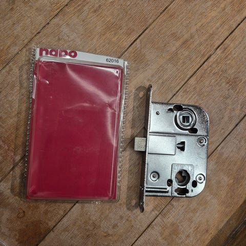 Habo låskasse med tilhørende sluttstykke. Låskassen leveres i hvit utførelse og er beregnet for innfelling i dør. Pakken inneholder låskasse, sluttstykke og skruer for montering. Egnet til bruk i innerdører eller andre dører der denne typen innfellingslås passer i mål og utførelse.