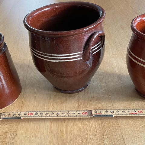 Vintage / Retro / rustikke brune keramikk krukker. Har blitt bruk som redskapskrukker og blomsterkrukker.