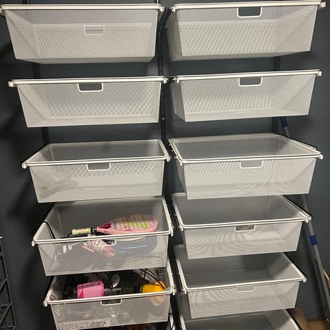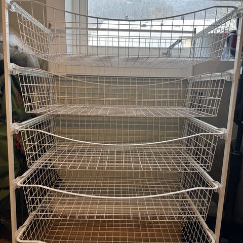 Elfa - 4 stativ (to lave og 2 høye) med totalt 13 kurver til salgs, 2 smale og 11 dype skuffer