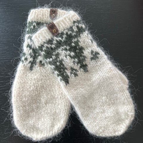Håndtova votter i ull i omtrentlig størrelse L. De er laget i norsk ull og er egnet som varme votter til og damer i størrelse L. Passer til bruk på kalde dager utendørs for disse er varme!