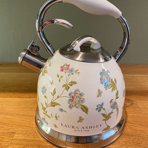 «Med sitt elegante China Rose-mønster i blått og hvitt er Laura Ashley vannkjele både et funksjonelt og estetisk valg. Den har en kapasitet på 3 liter, ideell for å koke vann til store mengder drikke på én gang. Den innebygde fløyten gir beskjed når vannet koker og bringer med seg en nostalgisk stemning som passer godt i klassiske kjøkken.