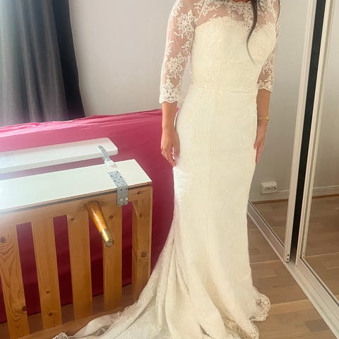 Kjøpt ny høst 2025, nypris 11990kr og brukt i desember. Kjolen er kjempe behagelig med nydelig detaljer. Var selv rundt 20 uker gravid i bryllupet og var fortsatt veldig komfortabel å gå med hele dagen.