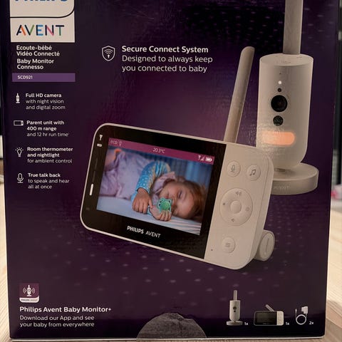Philips Avent SCD841 babycall med video i hvit og blå farge. Sett med foreldreenhet med fargeskjerm og barneenhet med kamera. Foreldreenheten har innebygd høyttaler, mikrofon, menyknapper og støttefot. Barneenheten har kamera, høyttaler og mulighet for veggmontering på undersiden. Leveres med strømadapter og ledning slik det vises på bildene. Egnet for overvåking av baby eller små barn i hjemmet.