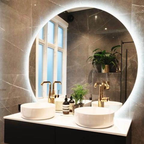 Speil baderomsspeil med LED-lys i uregelmessig, organisk form. Speilet har integrert lysramme langs kanten som gir jevn belysning rundt speilflaten. Passer til montering på bad eller andre rom der det er behov for speil med innebygd belysning.