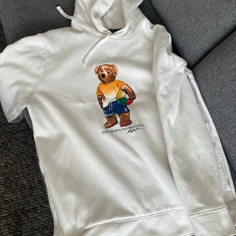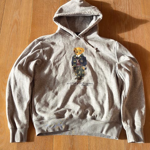Ralph Lauren hettegenser for herre i størrelse S. Hettegenseren er blå og laget av bomull. Genseren har hette med snøring og kengurulomme foran. På brystet er det et motiv med en bjørn. Passer til hverdagsbruk og fritid.