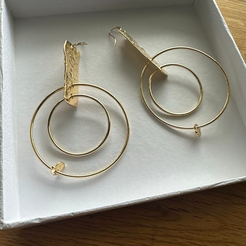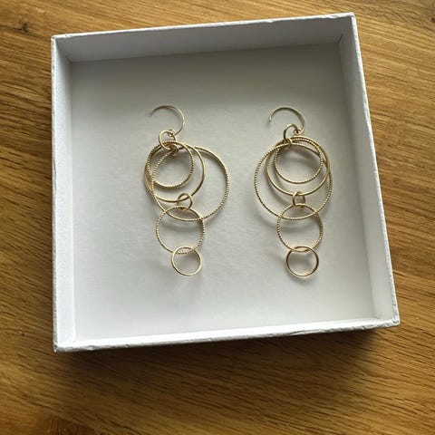 Øredobber for dame i gullfarget metall. Modellen har hengende design med flere runde ringer og skjellformet anheng nederst. Øredobbene festes med stift og lås bak. Passer som tilbehør til ulike antrekk der man ønsker et markert smykkeuttrykk.
