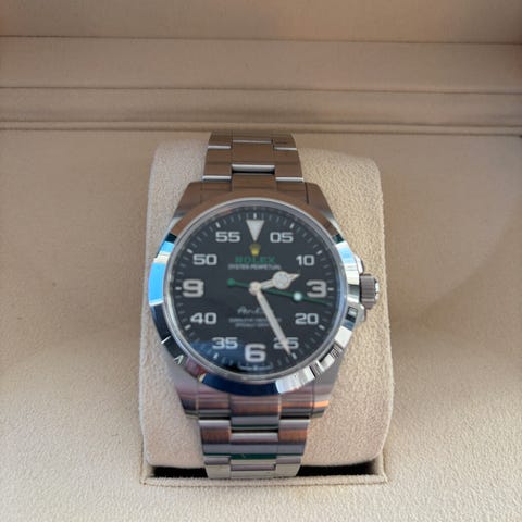 A super clean vintage Air King purchased from Danny's Vintage Watches in New York a few years ago. Serviced through Bjerke in 2023 so condition and function is tip top. I have worn it a bit since then so there are some hairlines as can be expected. Given the watches age the bracelet is in great shape. Selling so I can fund a new watch purchase. Comes with service case and card.