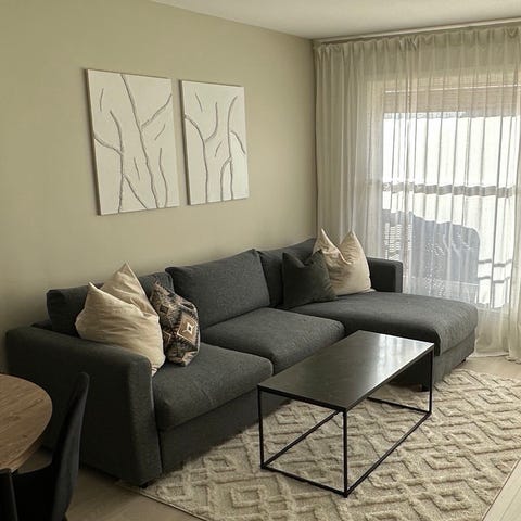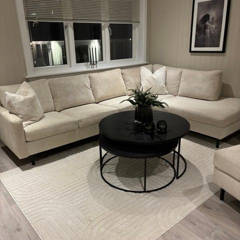 Meget pen sofa 3 år gammel. Kan brukes både som hjørne eller 3 og 2-seter da det følger med ekstra gavler. Stoff i beige med lys eik bein. Meget pent holdt.
