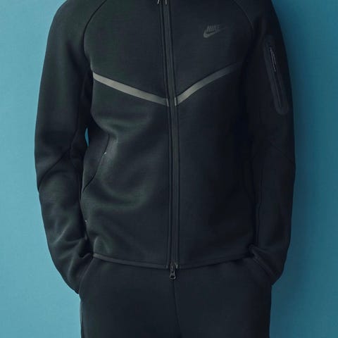 Nike joggedress for herre i størrelse M. Sett med hettejakke og bukse i beige bomullsmateriale med kontrastfelt. Jakken har glidelås foran og lommer, buksen har strikk i livet og ved anklene. Passer til hverdagsbruk og lett aktivitet.