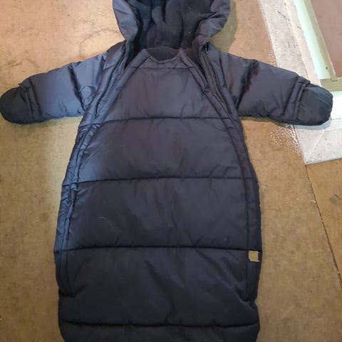 Pent brukt vinterpose fra H&M i str 62-68. Kan brette over på armene så de er tildekket, eller ha d åpent med votter på. Passer like godt i bilstol som i vogna. Hvit utenpå med søte ører på hetta. Brune bamser i fleece foret.