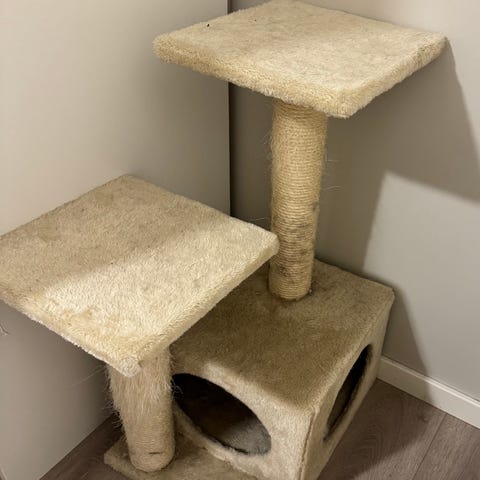 Det meste er pent brukt og uten skader, utenom hengekøyen på kloremøbelet. Kloremøbelet har 2–3 nivåer (jeg har brukt det med 2 da jeg synes det blir litt ustødig med 3, en handy person kan nok enkelt forsterke/fikse dette). Hengekøyen er godt brukt (se bilder), ellers fungerer alt som det skal.