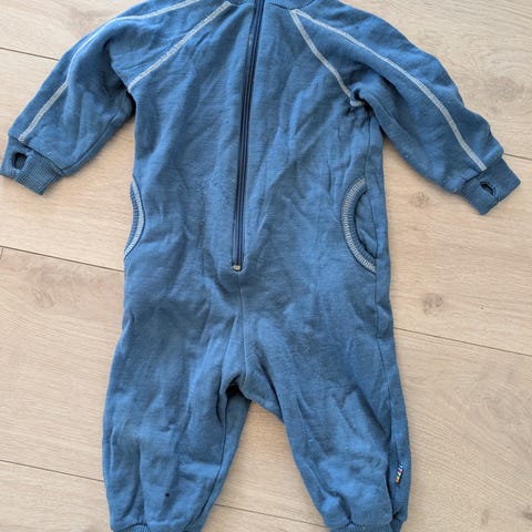 Heldressen er i blå farge med mønster og har lange ermer og ben. Modellen er unisex og har knapper foran for enkel av- og påkledning. Egnet som inne- eller mellomlagsplagg for små barn.