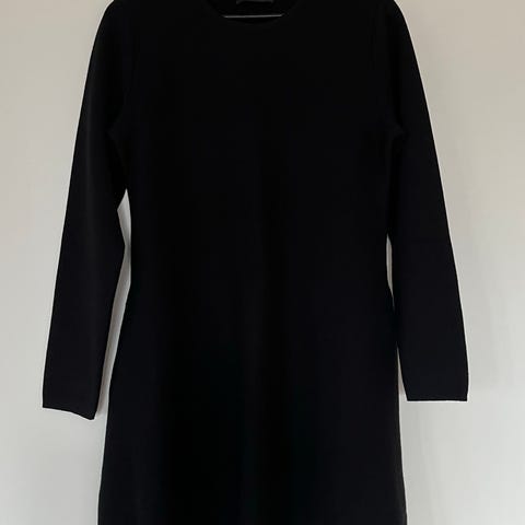 Svart kjole i 100% merinoull fra Ella&Il i modellen "Cecilie long". Jeg er 178 cm høy og kjolen rekker til over knærne. Merkelappen på venstre side av kjolen er klippet av.