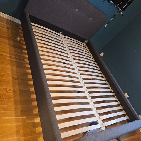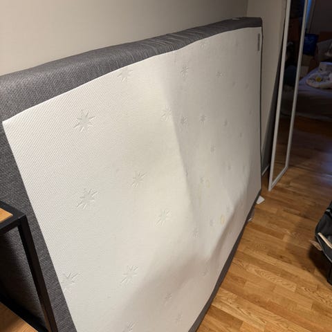 Selger den sengen sammen med hodegavlen.seng med madrass i nøytral utførelse. Sengen har grått tekstiltrekk på rammen og hodegavlen, samt en lys madrass med strukturert overflate. Ben i metall gir stabil støtte. Passer som vanlig sengeløsning på soverom eller gjesterom. Nøytral farge gjør at sengen enkelt kan kombineres med ulik innredning. Størrelse, modellnavn og materialspesifikasjoner er ikke oppgitt av selger.