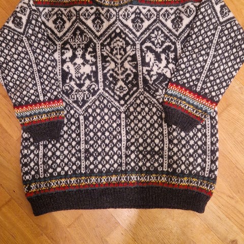 Hjemmestrikka OL ullgenser. Svært lite brukt, og framstår som ny