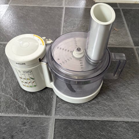 Braun kjøkkenmaskin med flere deler og tilbehør. Enheten har hovedbase med kontrollhjul for hastighet og funksjoner, samt bolle i plast med lokk og materør. Medfølgende tilbehør inkluderer ulike skiver og kniver for kutting, riving og hakking. Passer til matforberedelse som hakking av grønnsaker, riving av ost og lignende kjøkkenoppgaver. Maskinen leveres med original eske og bruksanvisning slik det fremgår av bildene.