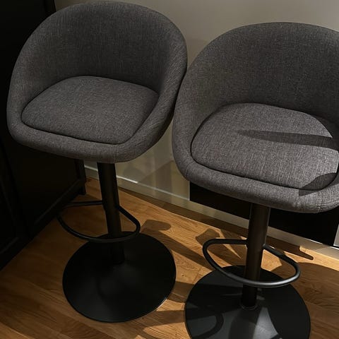 2x Barstol vintage brunt skinn med fotstøtte, justerbar høyde, totale mål er 43 x 49,5 x 91-111 cm.