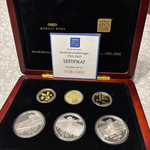 Alle tre 100-årsmyntene, Landbruk, Olje og Data i skrin og sertifikat.