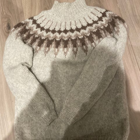 Varg ullgenser i alafosslopi selges med tungt hjerte da den er litt for liten og blir da ikke brukt. Tykk og varm genser i alafosslopi med kjempefint mønster. Ekstra tykk og varm pga mønsteret over brystet som er strikket med flere farger. Str S. Full lengde 63 cm, Bredde 48 cm, Arm 47 cm.