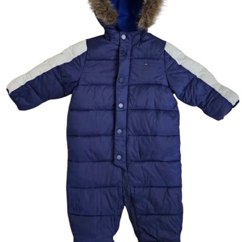 H&M heldress for gutt i størrelse 74. Dressen er blå og har mykt fleecefôr på innsiden. Ytterstoffet er vattert og har horisontale sømmer. Heldressen har hette og lang glidelås foran som går skrått nedover for enkel av- og påkledning. Egnet som yttertøy for små barn i kjøligere vær.
