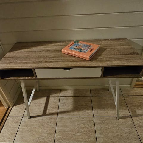 Skrivebord fra IKEA, hvit med to skuffer og en "luke" på toppen. To hull oppi "luka" til ledninger.