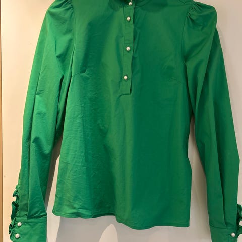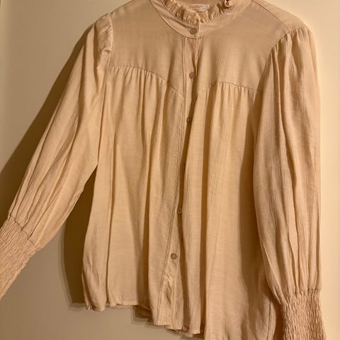 Bluse fra hill studio ,eillen shirt,selges.nesten ikke brukt, helt som ny.Offhvite med ståkrage og fine trekte knapper helt ned.Volumiøse ermer/m strikk nederst.Fin både til jeans og penbukse!