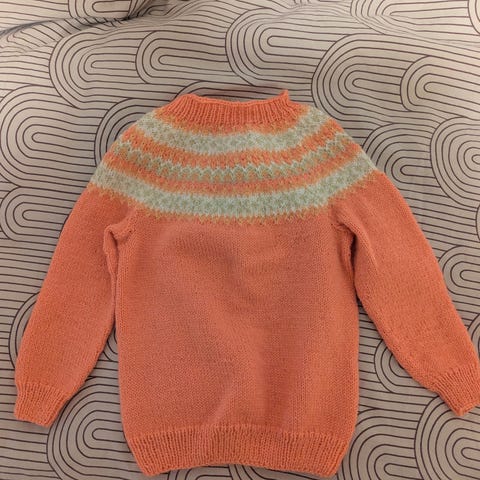 Hjemmestrikket Dahlia genser (strikket i Sandnes Sunday) 9-12mnd 200,-