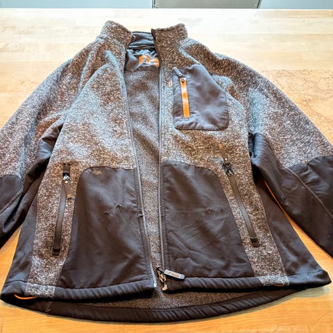 Univern At Work skalljakke i størrelse XL (58–60). Jakken er grå og har hette. Den har glidelås i front og flere glidelåslommer. Ytterstoffet er laget for bruk i arbeidssituasjoner og utendørsaktiviteter, med forsterkede partier på ermer. Jakken passer til bruk i variert vær der det er behov for et beskyttende ytterlag.