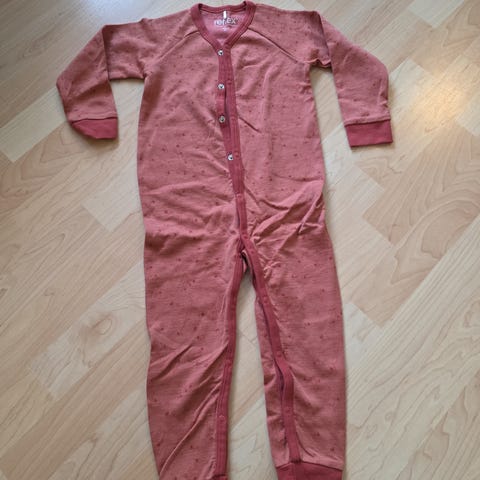 Reflex ulldress i størrelse 98. Dressen er i brun ull med hel glidelås foran og lange ermer og ben. Egner seg som mellomlag eller inneplagg på kjølige dager. Laget i ull som gir god varme og komfort for barnet. Pent brukt