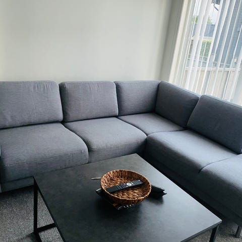 Brukt mørk grå sofa. Ingen merker, noe slitte sitteputer. Må hentes mellom 24.–28. februar.