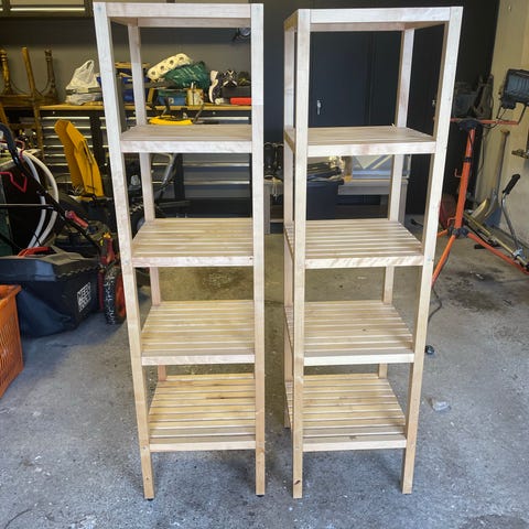 To klassiske BBB-reoler i limtre furu, gammel type. Original hvitlasert utførelse. Kan settes opp på flere måter.