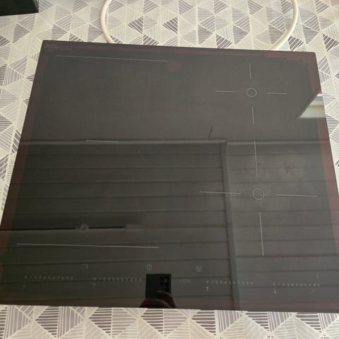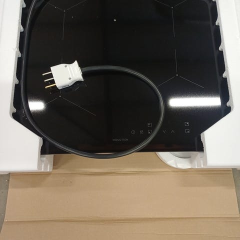 Electrolux HOB830XK induksjonstopp i svart glass. Platetoppen har berøringsbetjening i front med tydelig markerte kokesoner og effekttrinn. Induksjonsteknologien gir rask oppvarming og presis regulering av varmen. Enheten er beregnet for innbygging i benkeplate og har elektrisk tilkobling som vist på merkeskiltet (blant annet 230 V). Undersiden er i metall med integrerte vifter for kjøling. Passer som platetopp på kjøkken der man ønsker en plan, glasskeramisk induksjonstopp fra Electrolux.
