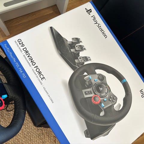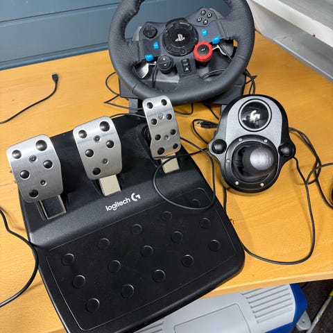 Selger Logitech G29, pakken består av: ratt, pedaler ( clutch, brems og gass ). Følger også med girspak.