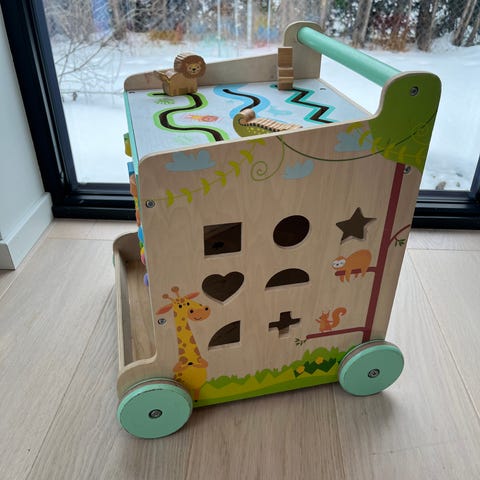 Denne vognen er laget av tre og har hjul, håndtak og flere spennende aktiviteter.