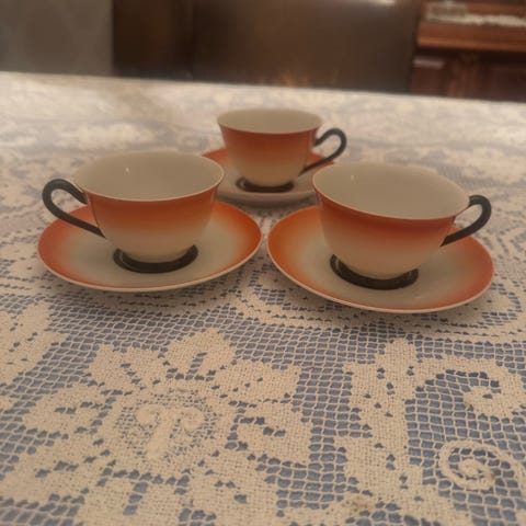9 kopper med skål og en kanne som er signer under med en N for Nora. Art deco.