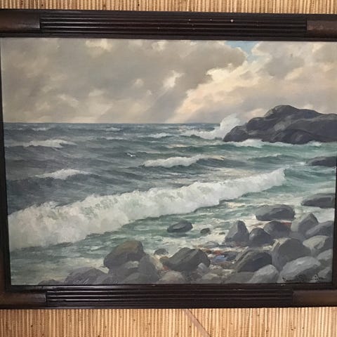 O. Westli maleri med kystmotiv som viser hav, bølger og svaberg. Bildet er horisontalt og innrammet i en profilert treramme. Signert «O. Westli» og datert «82» nede til høyre på motivet. Baksiden viser oppspent lerret på blindramme med opphengstråd. Egner seg som veggdekor i stue, gang eller andre oppholdsrom der man ønsker et natur- og kystmotiv.