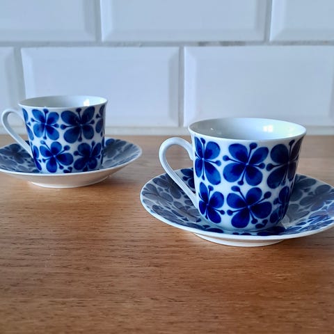 Arabia Sinilintu (Blåfugl) kopper med skåler, designet av Raija Uosikkinen.