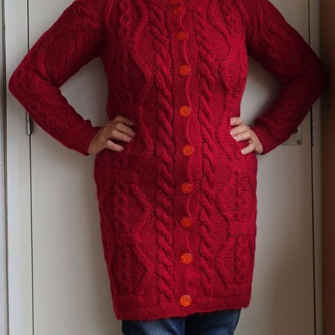 Ny håndstrikket dame lang jakke i 100% bomull, størrelse 42
