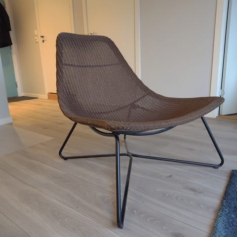 Stol i svart stoff med slanke metallben. Sete og rygg har avrundet form som gir god sitteflate. Passer som ekstra stol i stue, soverom eller kontor.