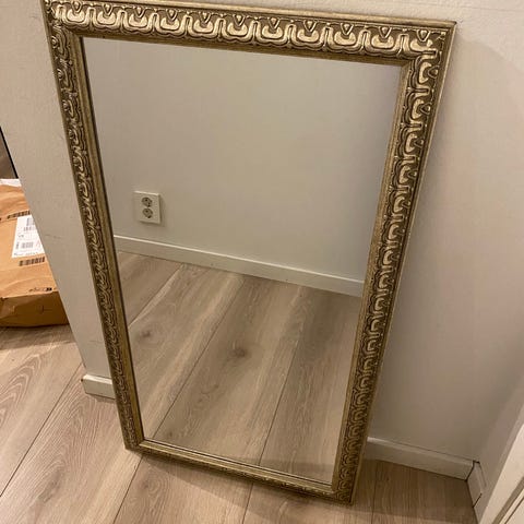 Selger dette fine speilet med gullkant, 85 cm i diameter. Selges da jeg må bytte ut speilet med et speil som kan henges opp med skruer.