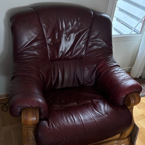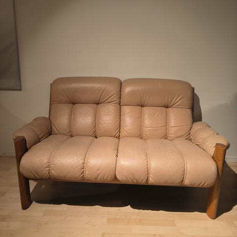 Godt brukt — tydelig krakelering og slitasje på armlenene (se bilder), noen overflatiske riper på sider og bakpanel. Seteputene er i bedre stand. Rammen er stabil og solid. Prisen er satt deretter.