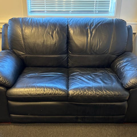 Gir bort to identiske 3-seter skinnsofaer fra Ekornes, kjøpt på 1990-tallet. Typisk norsk kvalitetsmøbel med avrundet form og vertikale kanalsømmer i skinnet.
