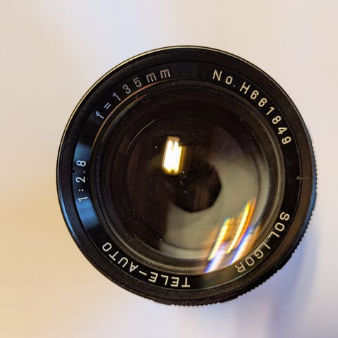 Vintage objektiv fra Sun Opt. Japan. Brukt til gamle analoge SLR Nikon F kameraer.