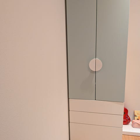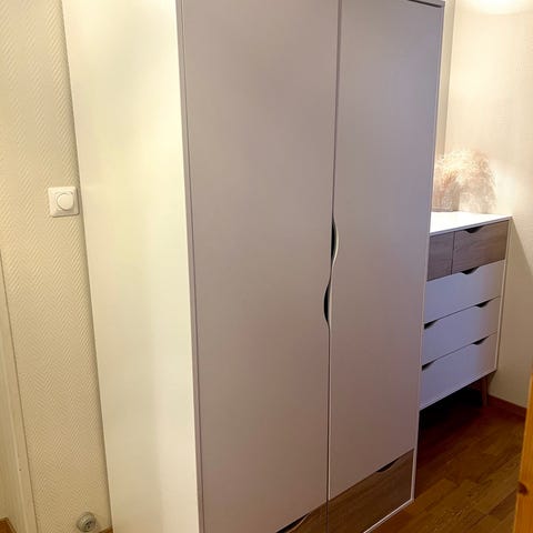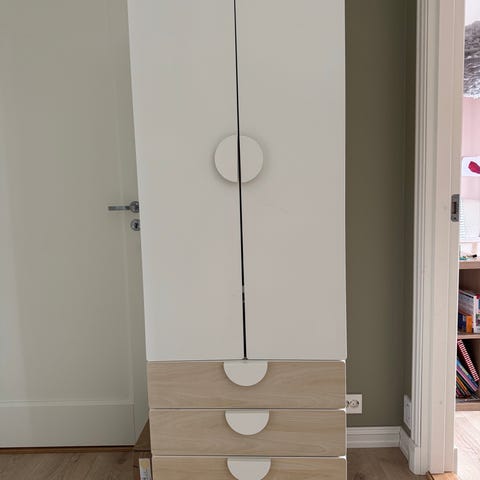 IKEA garderobeskap kombinasjon i hvit og trestruktur. Løsningen består av et høyt skap med garderobestang, hylle og tre skuffer, samt et lavere skap med doble dører og hyller. Skapet har runde knotter i tre. Egnet til oppbevaring av klær, sko og tilbehør/leker på soverom, barnerom eller i gang.
