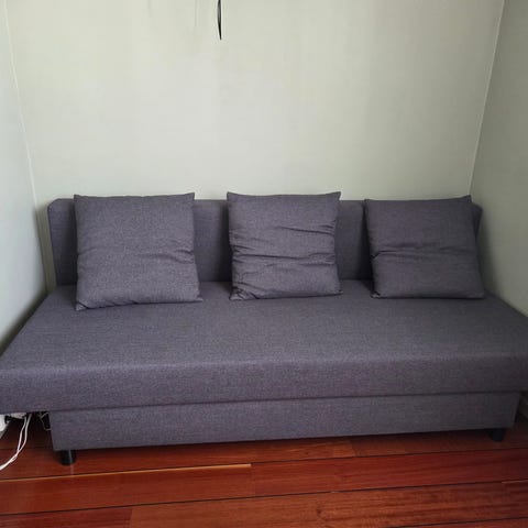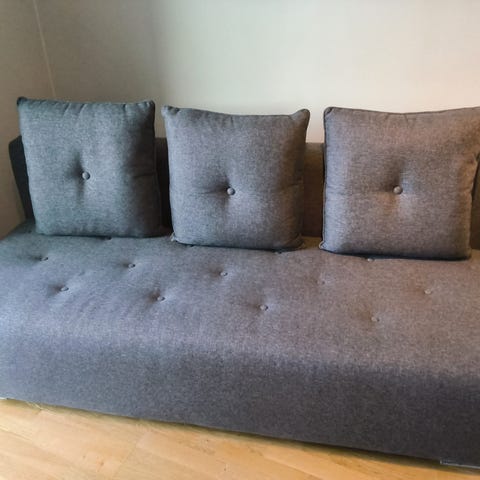 Selger en grå sovesofa som vist på bildene.