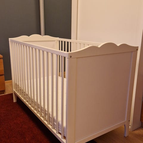IKEA sprinkelseng i hvit utførelse. Sengen har sprosser på tre sider og tette gavler på kortsidene. Passer til små barn som trenger trygg og avgrenset soveplass. Egnet for bruk på barnerom eller soverom som barneseng/babyseng. Standard rektangulær form tilpasset vanlig madrass for sprinkelseng (madrassmål avhenger av modell). Laget i malt treverk/plateverk med åpne sprosser som gir god lufting rundt barnet.