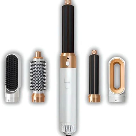 Sharflex hårstyler med flere utskiftbare munnstykker og børster for styling og tørking av hår. Settet inkluderer hovedenhet, ulike børste- og krølletilbehør samt oppbevaringsetui. Egnet for styling av ulike hårtyper og lengder.
