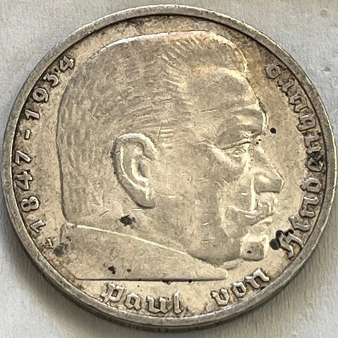 5 reichsmark 1936-D Tyskland , Paul von Hindenburg, stor sølvmynt