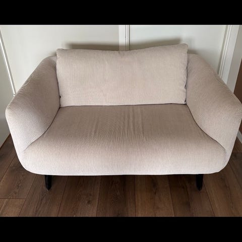 Sofa i lys beige tekstil. Sofaen har rette linjer med avrundede hjørner og en løs ryggpute. Den står på mørke, skråstilte ben som gir god høyde opp fra gulvet. Passer som sitteplass til to personer i stue, gjesterom eller mindre oppholdsrom.